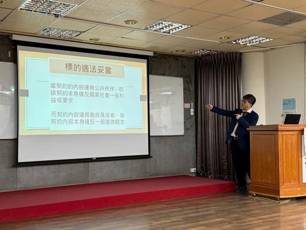 本次教育訓練聘請工務局政風室李政憲股長及得智法律事務所侯信逸所長擔任講師,講述陽光法案及工程法律與工程倫理等主題,有效健全與會公務員法治認知,深化依法行政與廉能意識,使本府之同仁均能以正確法治觀念來提昇行政效率。