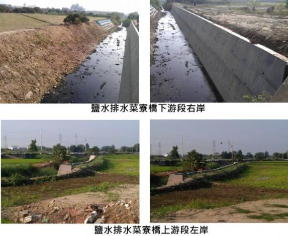 台南市府水利局為解決鹽水、新營區轄內易淹地區淹水問題,先行辦理災害預防工程及治水應急工程,分別為「新營區鹽水排水菜寮橋下游段右岸崩塌預防工程」、「新營區鹽水排水菜寮橋上游段左岸崩塌預防工程」及「鹽水排水菜寮橋段護岸應急工程」。鹽水及新營區的排水問題,為颱風暴雨時,急水溪水位高漲,各排水路短期內無法排出,相對低窪區無法重力排水,排水路堤岸高度不足,容易溢堤部分水路尚未施設堤岸防護,部分排水路寬度不足、逆坡等,造成排水系統不良。鹽水排水系統現況通水斷面寬窄不一、高低不齊,經水理演算後堤岸高度仍不足,易造成低窪區域淹水,應急工程主要整治段為菜寮橋附近渠段。