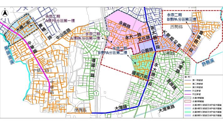 水利局表示,永康區污水下水道系統持續推動在建工程計四案,其中屬於永康PA分區第一標工程,範圍為中山高速公路以東、永平街以南、永大路二段以西、文化路以北,預計施工期程為540天,管線工程預計施作4,326公尺,用戶接管2,735戶;PB分區第一標工程範圍為柴頭港溪以東、縱貫鐵路以南、大橋重劃區以西、大橋一街以北,預計施工期程為540天,管線工程預計施作3,846公尺,用戶接管4,061戶;PA分區第二標工程範圍為永大路二段以西、公園路以南,大灣路942巷以東、國光六街以北區域,預計施工期程為560天,管線工程預計施作5,360公尺,用戶接管1,731戶;PA分區第三標工程範圍為文化路以西大灣重劃區區域以及北興街、富強路、西勢路所圍區域,預計施工期程為560天,管線工程預計施作5,301公尺,用戶接管1,850戶。