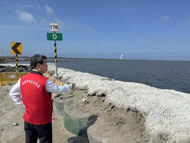 為提升沿海聚落抵禦暴潮,水利局於最短時間內緊急完成多項加高防護措施,包含七股區西寮社區防洪牆加高600公尺、將軍區青鯤鯓社區防洪牆加高400公尺,並於七股區鹽埕里建構三道總長達2,000公尺的防線,有效抵禦先前楊柳颱風及天文暴潮的雙重威脅。為進一步降低暴潮衝擊風險,黃偉哲市長指示水利局積極推動青山港汕沙腸袋工程,藉由沙洲復育防止海水沖入七股區內,優先預計搶修850公尺,已完成580公尺,完工後將可大幅提升七股區西寮、鹽埕等社區居民生命財產安全。